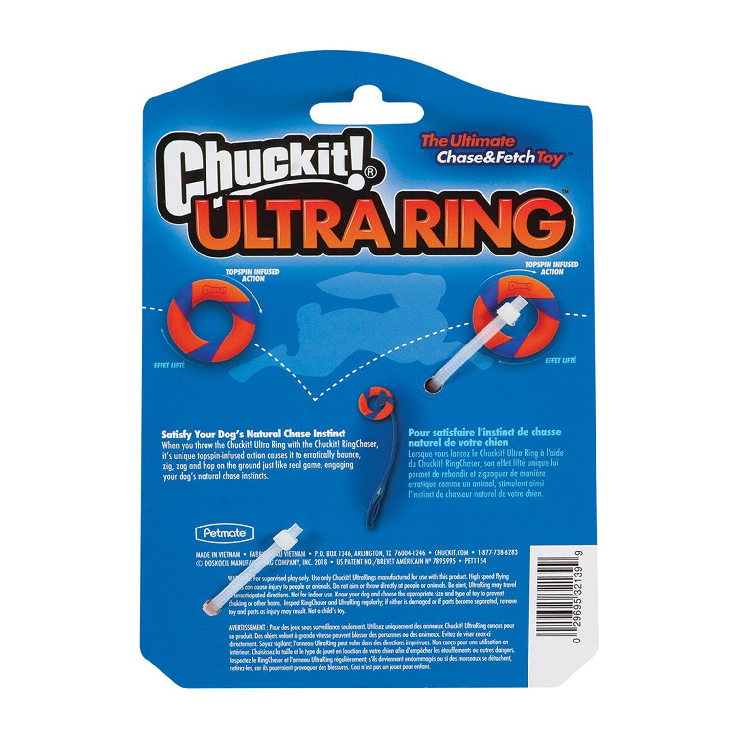 Make Fetch Happen with the Chuckit! UltraRing Dog Fetch Toy. The UltraRing is the ultimate chase and fetch toy because of the unique topspin infused action that causes the UltraRing to erratically bounce, zig-zag, and hop on the ground, engaging your dog's natural chase instincts. Bright colours make it easy to find, making it the ultimate chase and fetch toy. Compatible with the Chuckit! RingChaser for even more fetch fun!