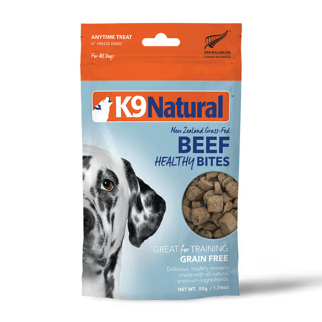 Treat your dog to a healthy, high-protein snack with K9 Naturals Grain-Free Beef Bites. Made from New Zealand grass-fed, free-range beef and organs, these bites are grain-free, gluten-free, and free from artificial preservatives or flavors.