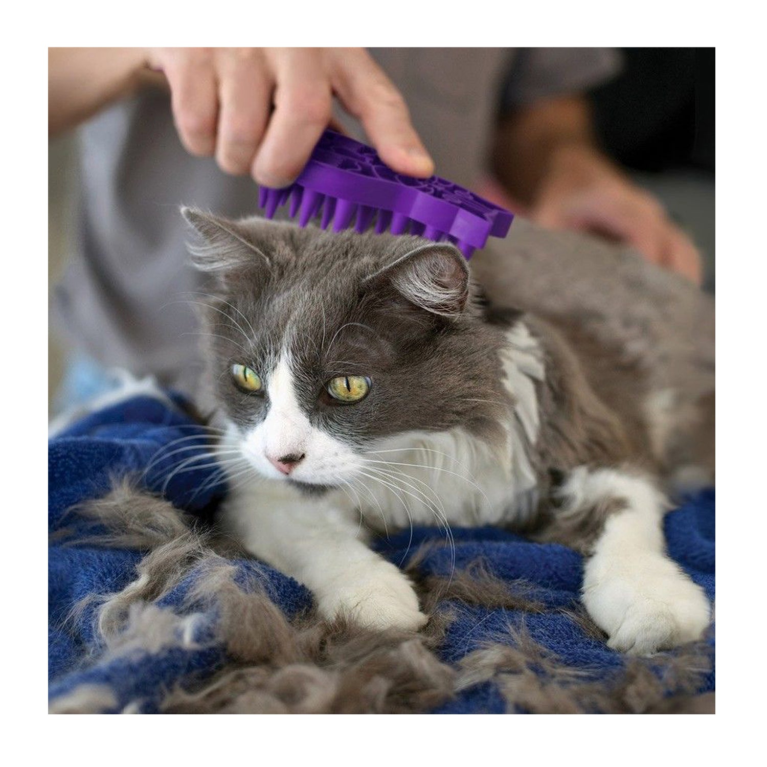 The KONG ZoomGroom for Cats massages and grooms at the same time. The soft, rubber fingers are a magnet for loose hairs. Regular grooming with the KONG ZoomGroom can help condition the skin and reduce hairball formation. The gentle massage action calms stressed or anxious cats, especially in potentially traumatic situations such as veterinarian visits. Firm and flexible 3/4"" rubber teeth reach through the coat to massage the skin.